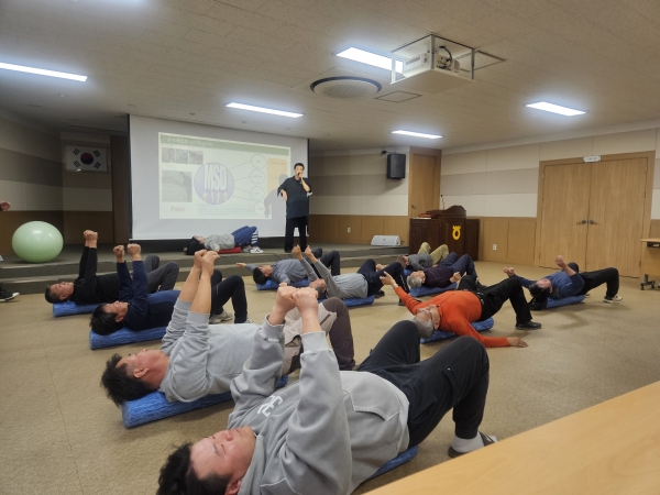 교육에 참여한 양상모 반장은 “매트리스, 마사지 크림, 벨런스볼 등을 활용한 기본 체조, 요통 예방 체조 실습, 맨손 마사지, 어깨 관절 체조 등으로 많은 도움이 됐다”고 말했다.