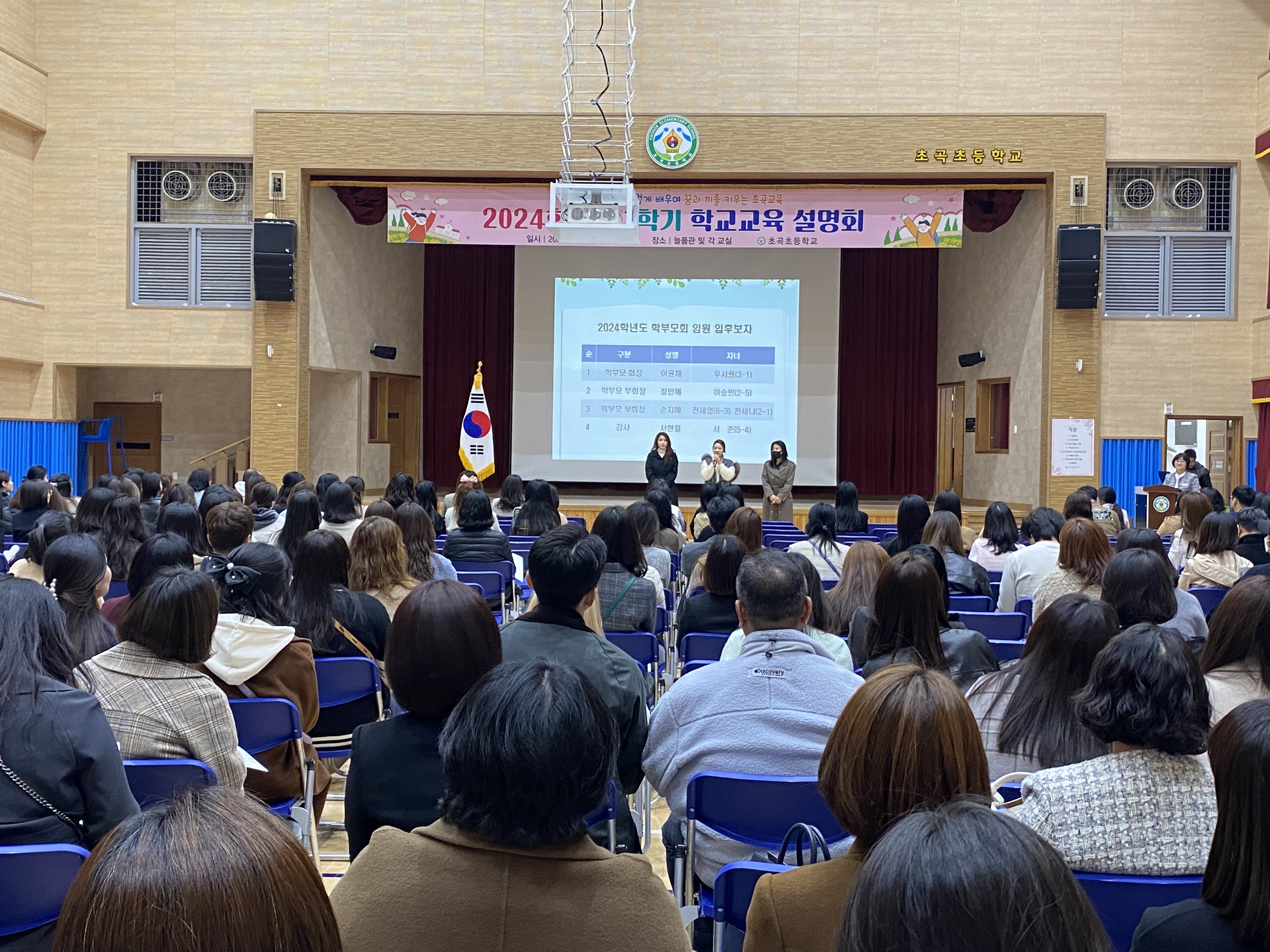 초곡초등학교(교장 조이제)는 3월 20일(수) 14시부터 늘품관(강당)에서 2024학년도 1학기 학교교육 설명회를 개최하였다. 본 설명회는 학부모 350여명이 참석한 가운데 학부모회 구성과 병행하여 진행하였다.