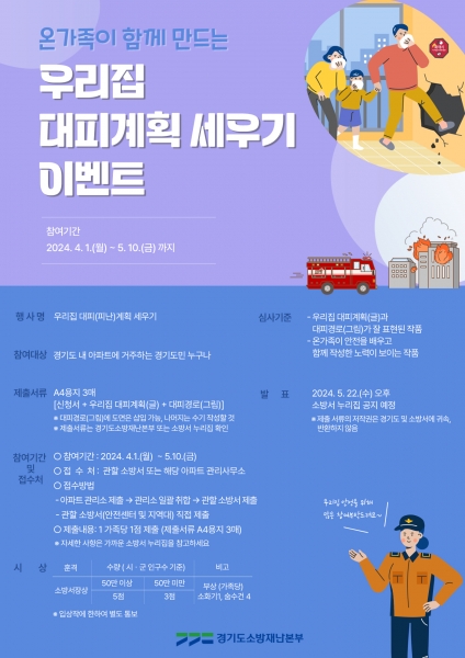이번 이벤트는 남양주시 소재 아파트에 거주하는 시민 누구나 참여할 수 있고 제출서류는 신청서 및 우리집 대피계획, 대피경로 포함 A4용지 3매로 남양주소방서 홈페이지 최신소식란에서 작성서식을 받아볼 수 있다.