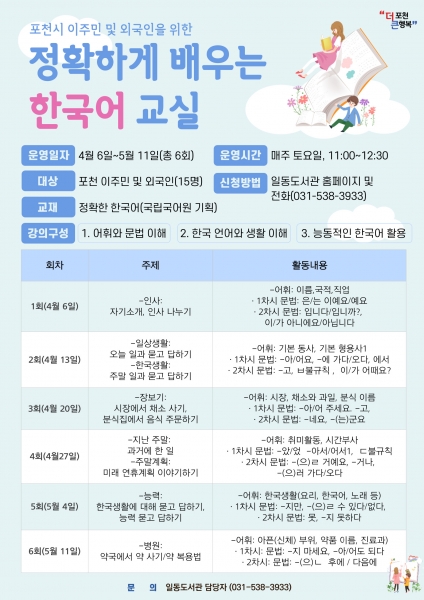 [금요저널] 포천시는 오는 4월 6일부터 5월 11일까지 매주 토요일 일동도서관에서 이주민의 한국어 능력 향상을 돕고 지역사회와의 소통을 촉진하기 위해 ‘정확하게 배우는 한국어 교실’을 운영한다.