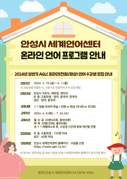 [금요저널] 안성시 세계언어센터에서 3월 15일부터 4월 1일까지 2024년 상반기 온라인 언어프로그램 수강생을 모집한다.