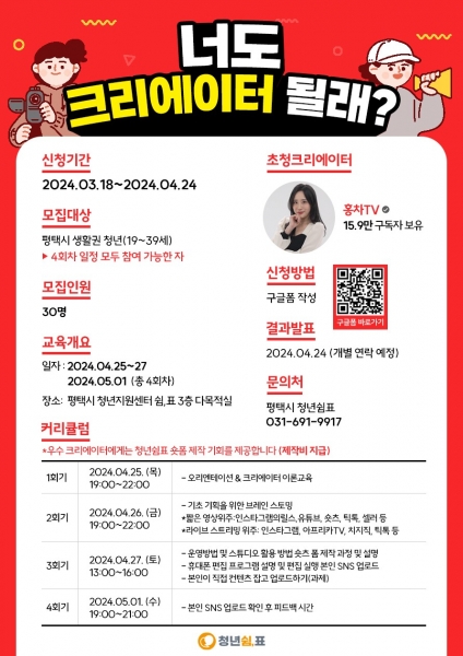 [금요저널] 평택시 청년지원센터 청년쉼,표는 오는 4월 24일까지 ‘청년크리에이터 양성과정’ 프로그램 참여자를 모집하고 있다고 밝혔다.