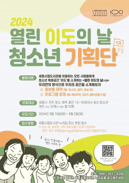 [금요저널] 세종시립도서관이 ‘2024년 열린 이도의 날 청소년 기획단 1기’를 모집한다.