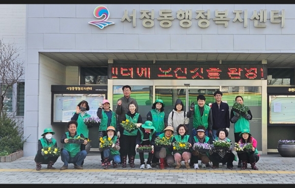 서정동을 찾는 많은 방문객에게 쾌적한 환경을 제공하기 위해 서정동 새마을부녀회와 새마을지도자회, 통장협의회 등 30여명이 참여해 팬지, 비올라, 데이지 등 5000본을 서정동 청사 주변 화단과 서정관광특구로 및 한창 입주 중인 서정동 힐스테이트 아파트 가로화단 꽃박스에 심으며 주변 환경정비를 실시했다.