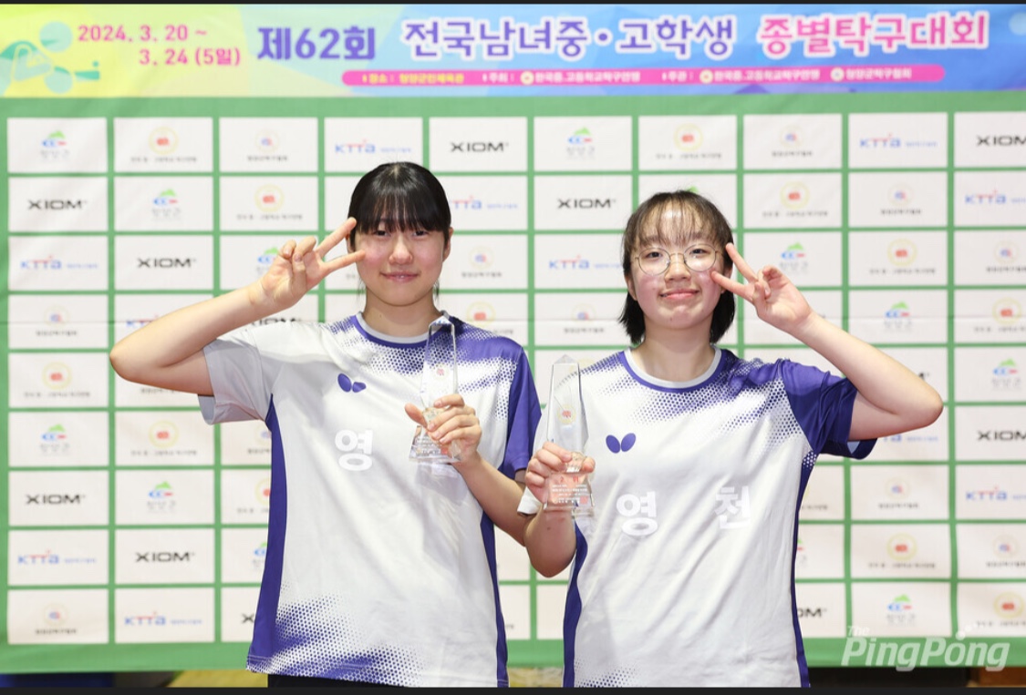 영천여자중학교(교장 박정숙) 탁구부는 지난 3월 19일(화)~24(일) 충남 청양국민체육센터에서 펼쳐진 ‘제62회 전국남녀중.고학생종별탁구대회’에서 여중부 단체3위와 개인복식(3학년 박예진, 2학년 박채원)조가 준우승을 차지했다.
