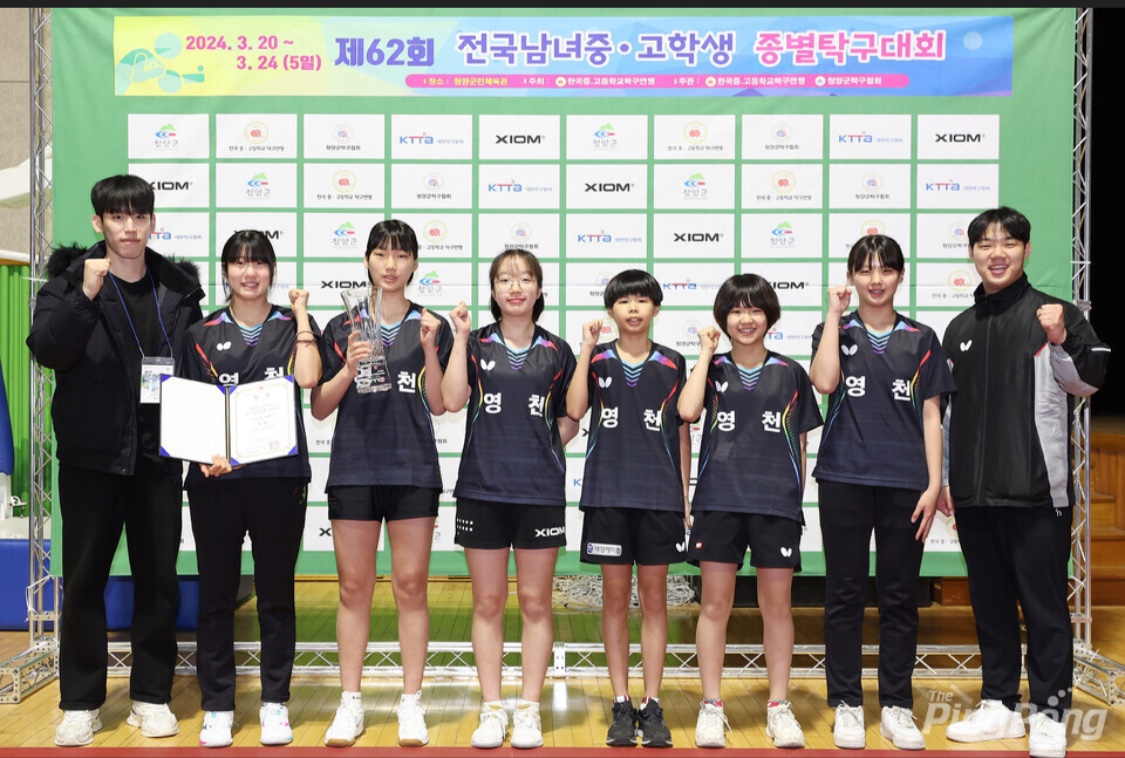 영천여중 탁구부는 역사와 전통을 자랑하며 정규수업 및 학교동아리 프로그램을 통해 교우관계 향상과 팀 워크를 다져왔다. 이번 대회로 전국에 영천여중의 탁구부의 기량을 다시 한번 확인한 계기가 되었다.