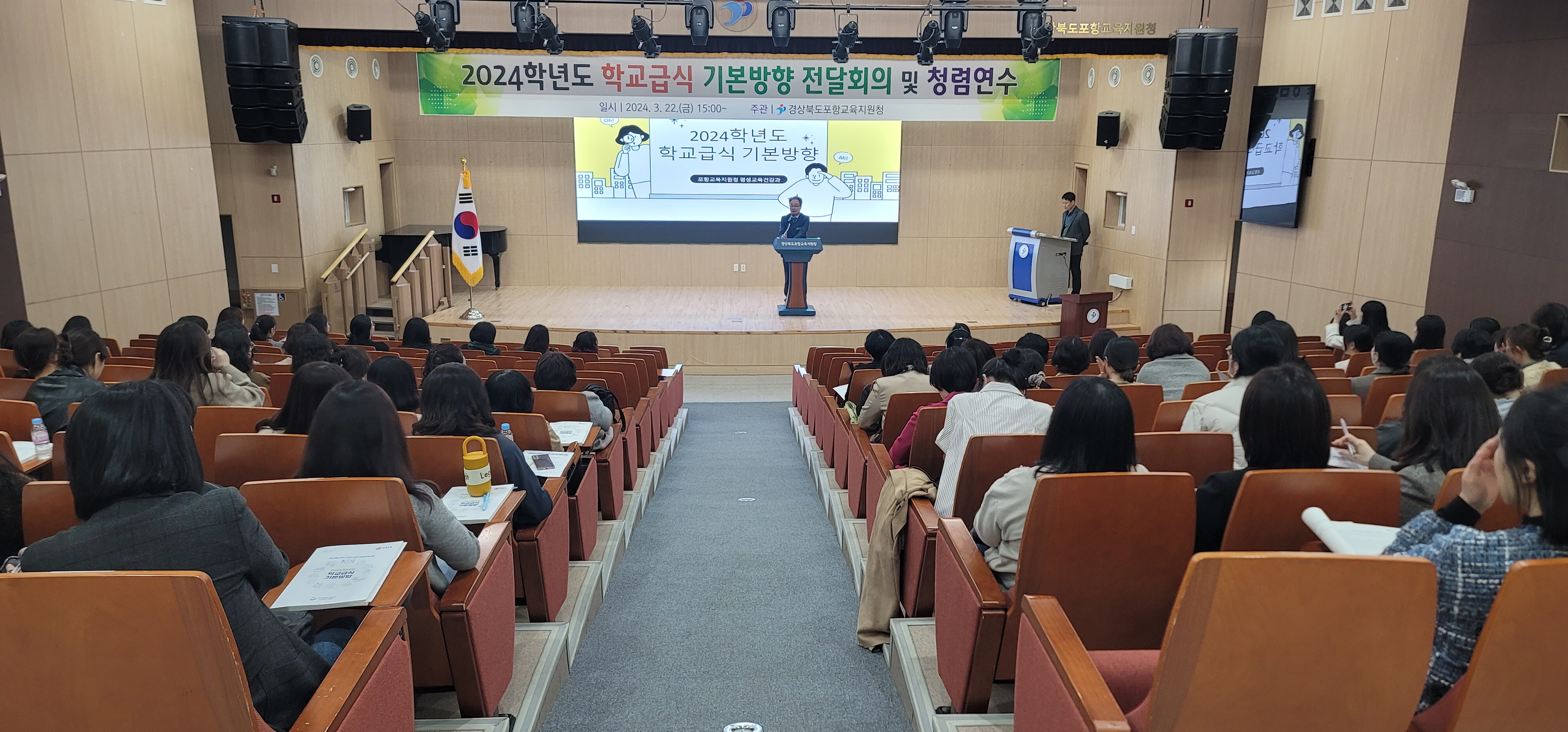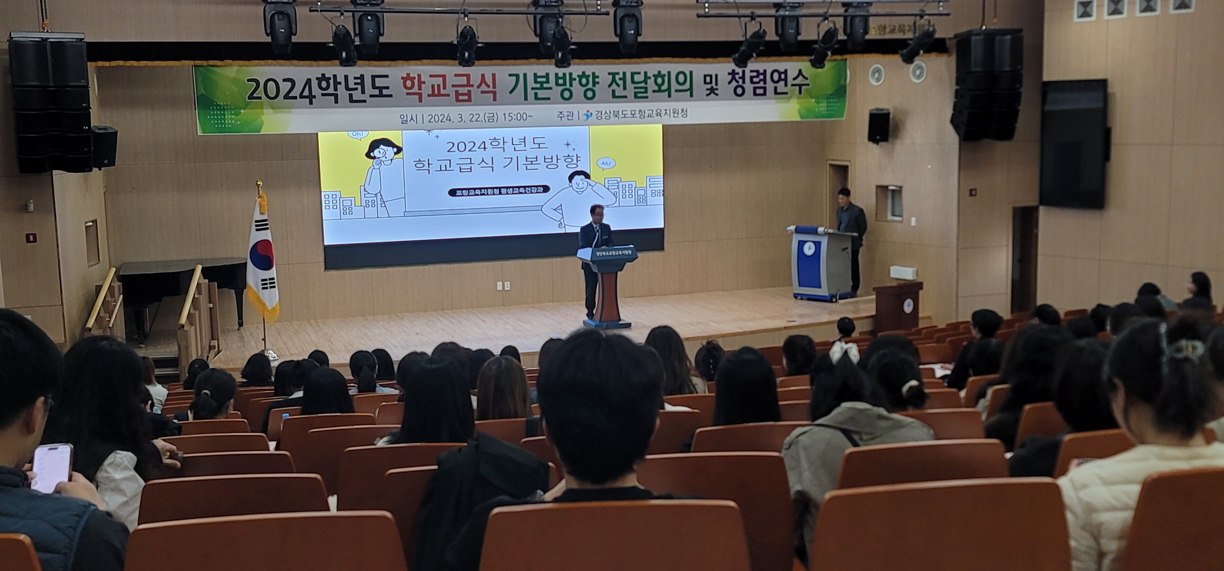 경상북도포항교육지원청(교육장 천종복)은 3월 22일(금) 포항 관내 영양(교사) 및 급식업무 담당자 130여 명을 대상으로 2024학년도 학교급식 기본방향 전달회의 및 청렴연수를 개최하여 진행하였다.