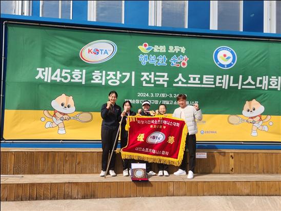 □ 작년 제44회 회장기 전국소프트테니스대회에서 우승을 거둔 선수단은 올해에도 준결승에서 같은 경북의 성신여중을 3대 0으로, 결승에서 전북 순창여중을 3대 1로 꺾고 단체전 우승을 차지하였다.