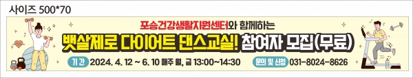 포승건강생활지원센터 관계자는 “활동량이 감소하고 꾸준히 비만율이 증가하는 가운데, 이번 프로그램이 지역주민의 활동량을 높여 건강과 일상생활에 활력을 드릴 수 있길 바란다”며 “많은 지역주민의 관심과 참여 부탁드린다”고 전했다.
