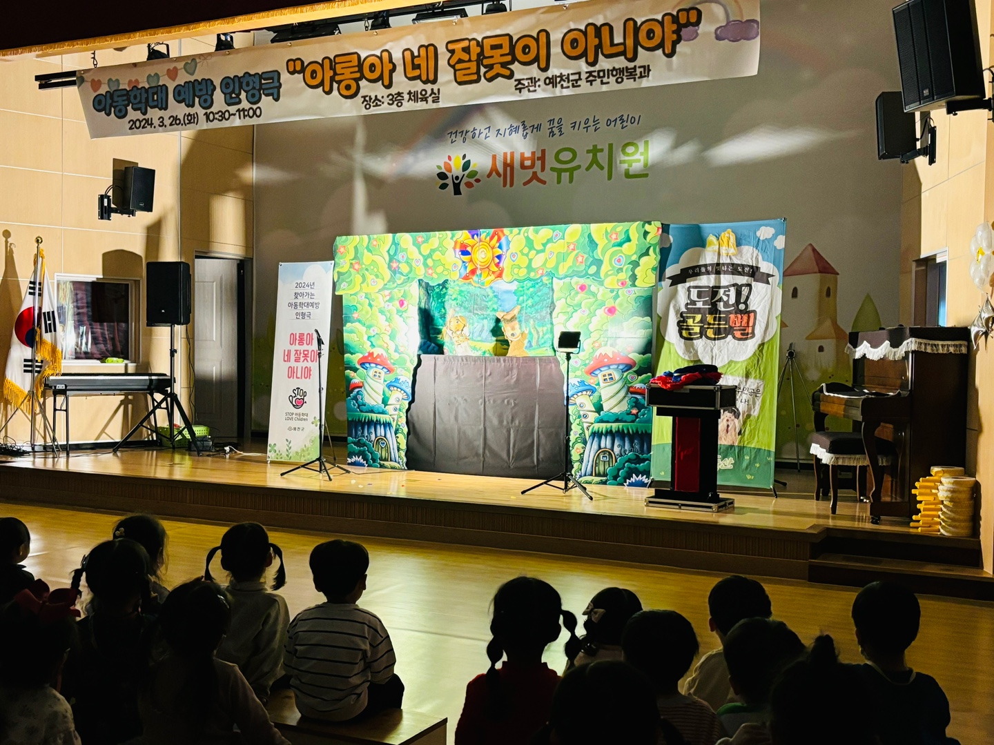 □ 예천군 공립 단설 유치원 새벗유치원(원장 우수경)은 예천군의 지원을 받아 3월 26일(화) 3층 체육실에서 전체 유아 122명을 대상으로 아동인권교육 및 아동학대예방 인형극을 실시했다.