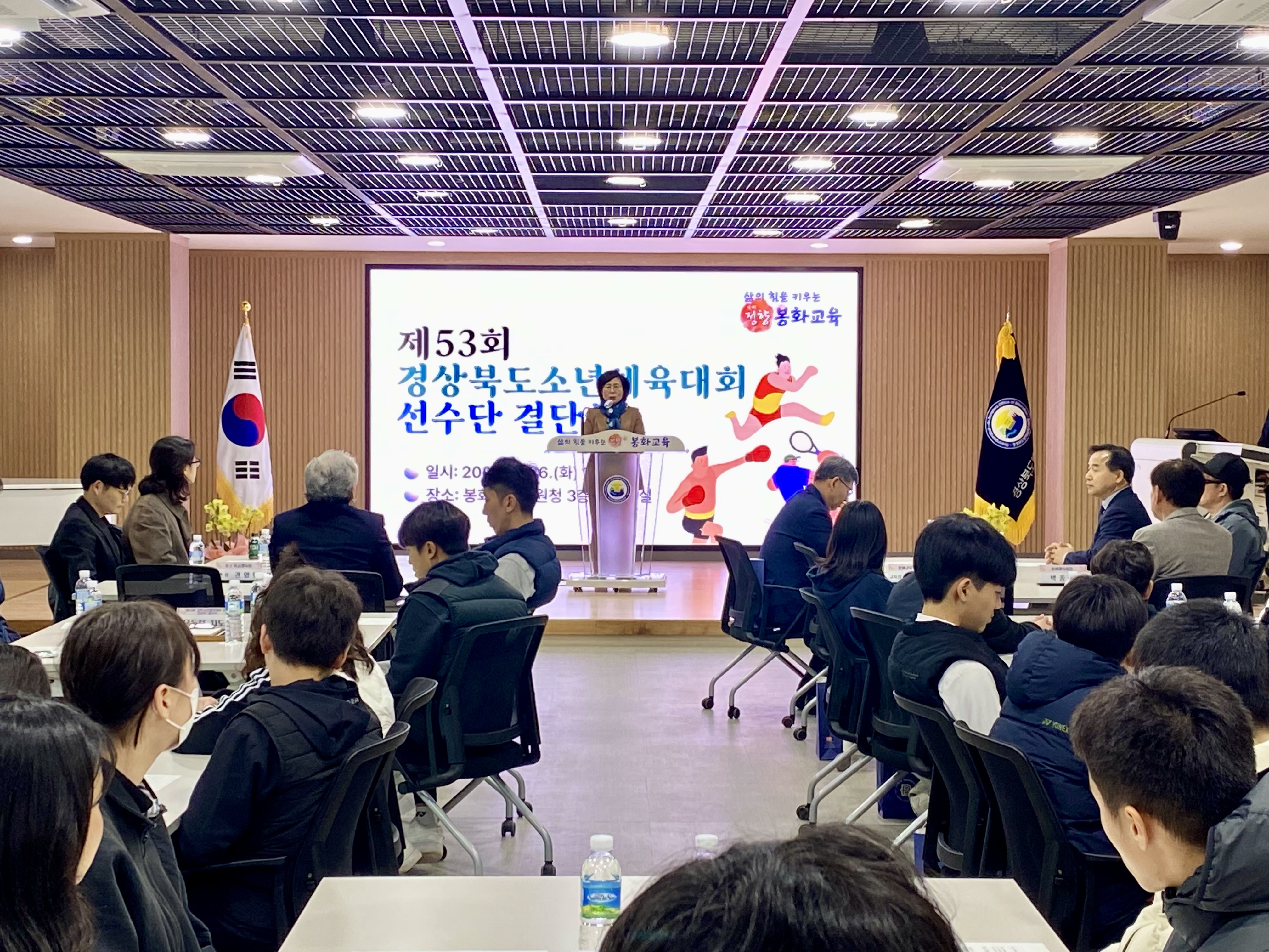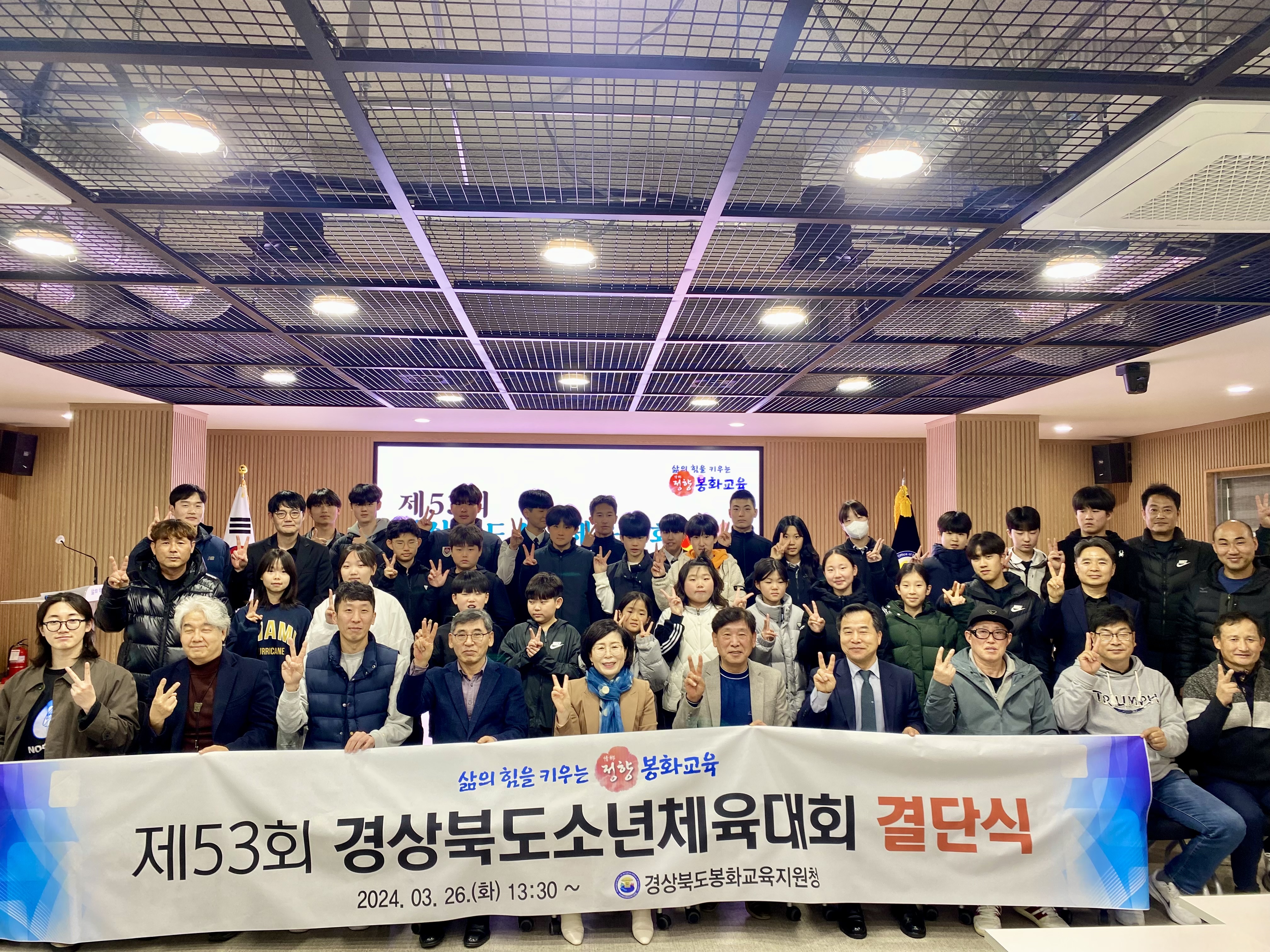 □ 경상북도봉화교육지원청(교육장 권혜자)은 2024년 3월 26일(화)에 청사 3층 대회의실에서 선수단 40여명이 참가한 가운데 ‘제53회 경상북도소년체육대회 선수단 결단식’을 개최하고 선수단을 격려했다.