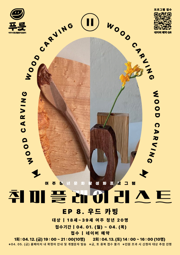 여주시 청년활동지원센터 관계자는 “청년들의 엄청난 관심을 받았던 3월 취플리 프로그램에 이어 우드카빙 편을 통해서 다채로운 취미생활을 경험하며 스스로에게 집중하는 시간이 마련되기 바란다”고 말했다.