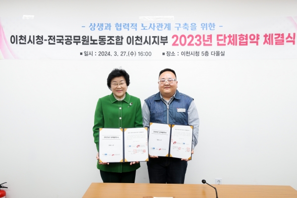 [금요저널] 이천시와 전국공무원노동조합 이천시지부는 3월 27일 이천시청 5층 다올실에서 공무원노조 설립 이래 3번째‘단체협약 체결식’을 가졌다.