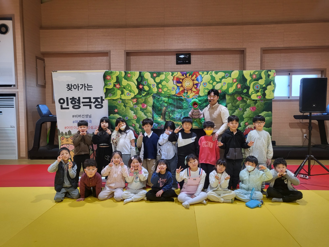 □ 고령초등학교(교장 안근모) 유치원 및 1학년 학생들은 3월 18일(월) 본교 유도관에서 인형극을 관람하였다.‘버릇없는 꿀돼지는 친구도 없어요.’라는 어린이 인성교육 인형극을 관람하며, 바른 말 고운 말 사용 및 예절에 대해 알아보는 시간을 가졌다.