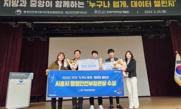 [금요저널] 시흥시는 행정안전부와 한국지역정보개발원이 주최한 ‘누구나 쉽게, 데이터 챌린지 대회’에서 시의 2개 과제가 최우수 과제로 선정돼 행정안전부 장관상을 수상했다고 지난 27일 밝혔다.