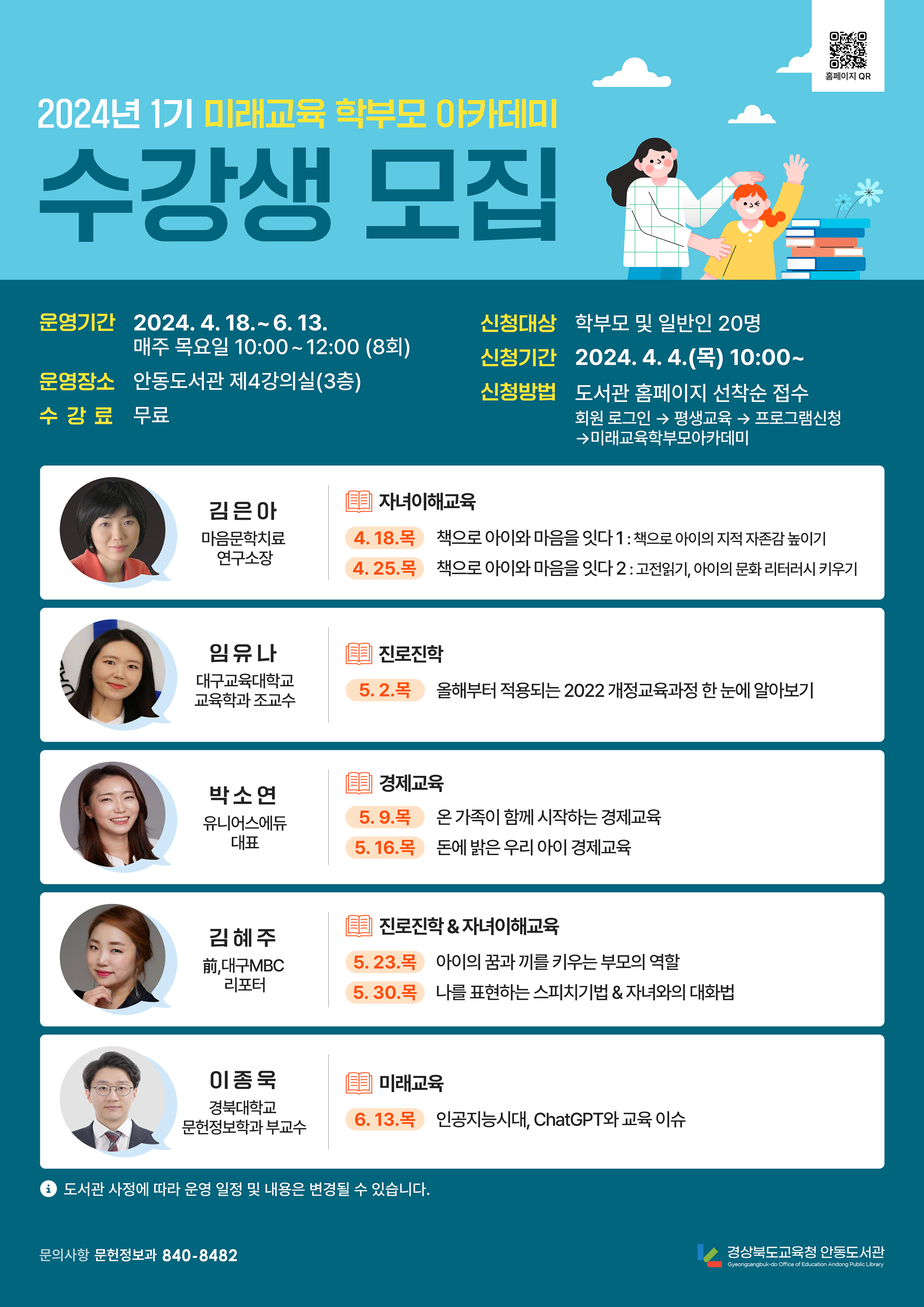 □ 경상북도교육청 안동도서관(관장 권오규)은 4월 18일부터 6월 13일까지 학부모 및 일반인을 대상으로「2024년 1기 미래교육 학부모 아카데미」를 운영한다.