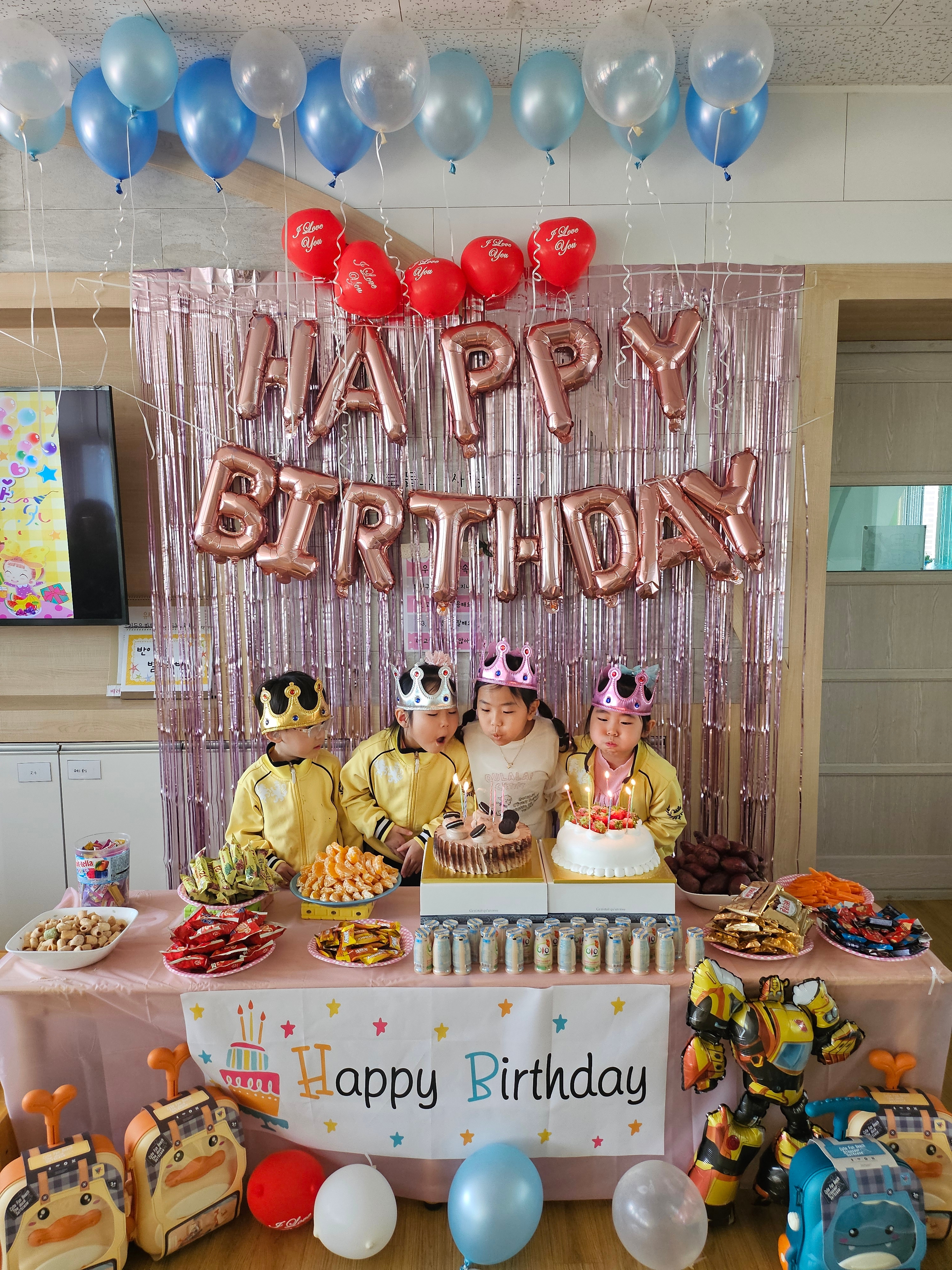□ 교실 한칸을 유아들을 위한 생일잔치를 위한 무대로 꾸몄다. 다양한 모양의 풍선 속에 헬룸가스로 채워 풍선을 천장에 붙이고 캐릭터 인형과 맛있는 여러 가지 음식들로 뷔페를 마련해 두었다.