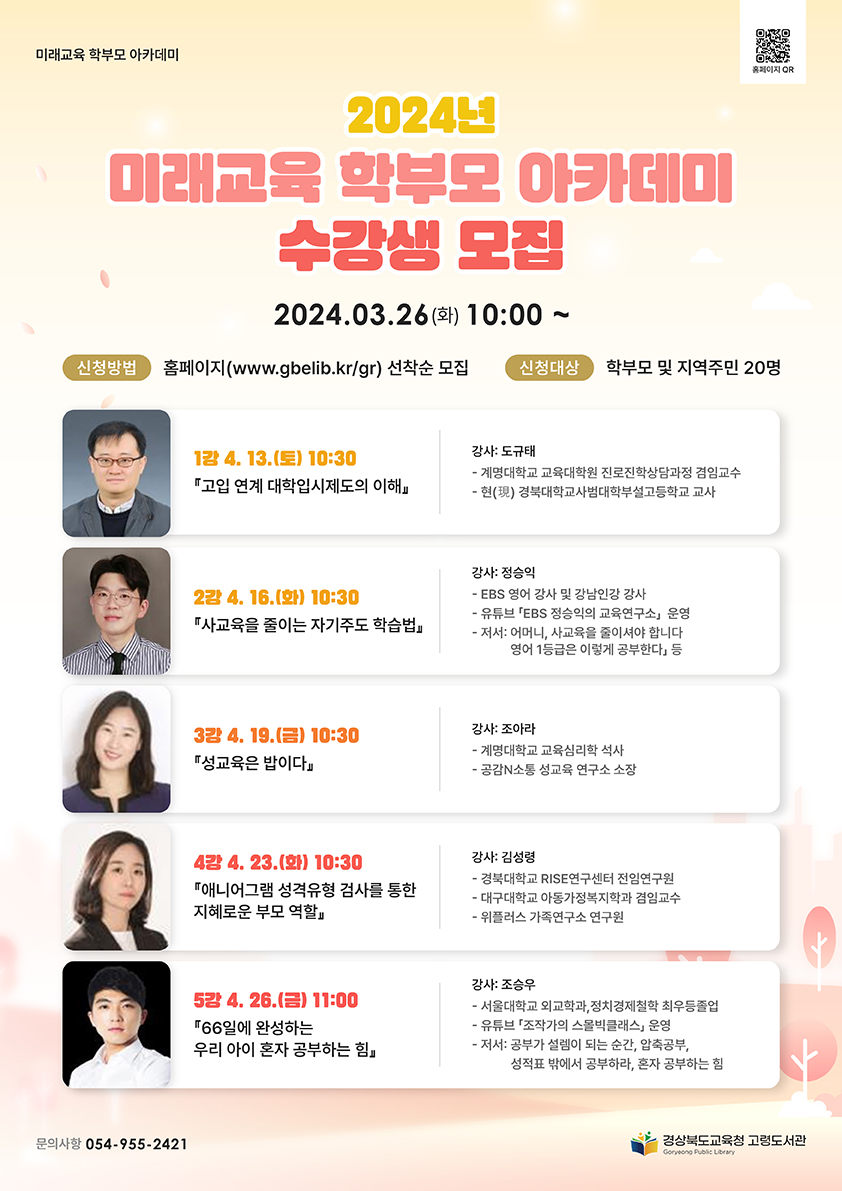 □ 경상북도교육청 고령도서관(관장 김효숙)은 자녀들의 진로와 학업에 대해 함께 고민하고 해결하는 교육 공동체를 형성하고 소통과 참여로 즐겁고 행복한 부모-자녀 관계에 도움을 주기 위해 2024년 미래교육 학부모 아카데미를 4월 13일(토)부터 4월 26일(금)까지 5회에 걸쳐 운영한다.