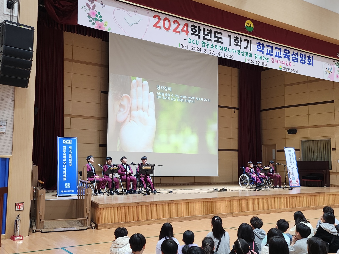 □ 경산 성암초등학교(교장 김장미)는 3월 27일, 전교생 및 학부모를 대상으로 대구카톨릭대학교 맑은소리하모니카 앙상블과 함께하는 장애이해교육을 실시하였다.