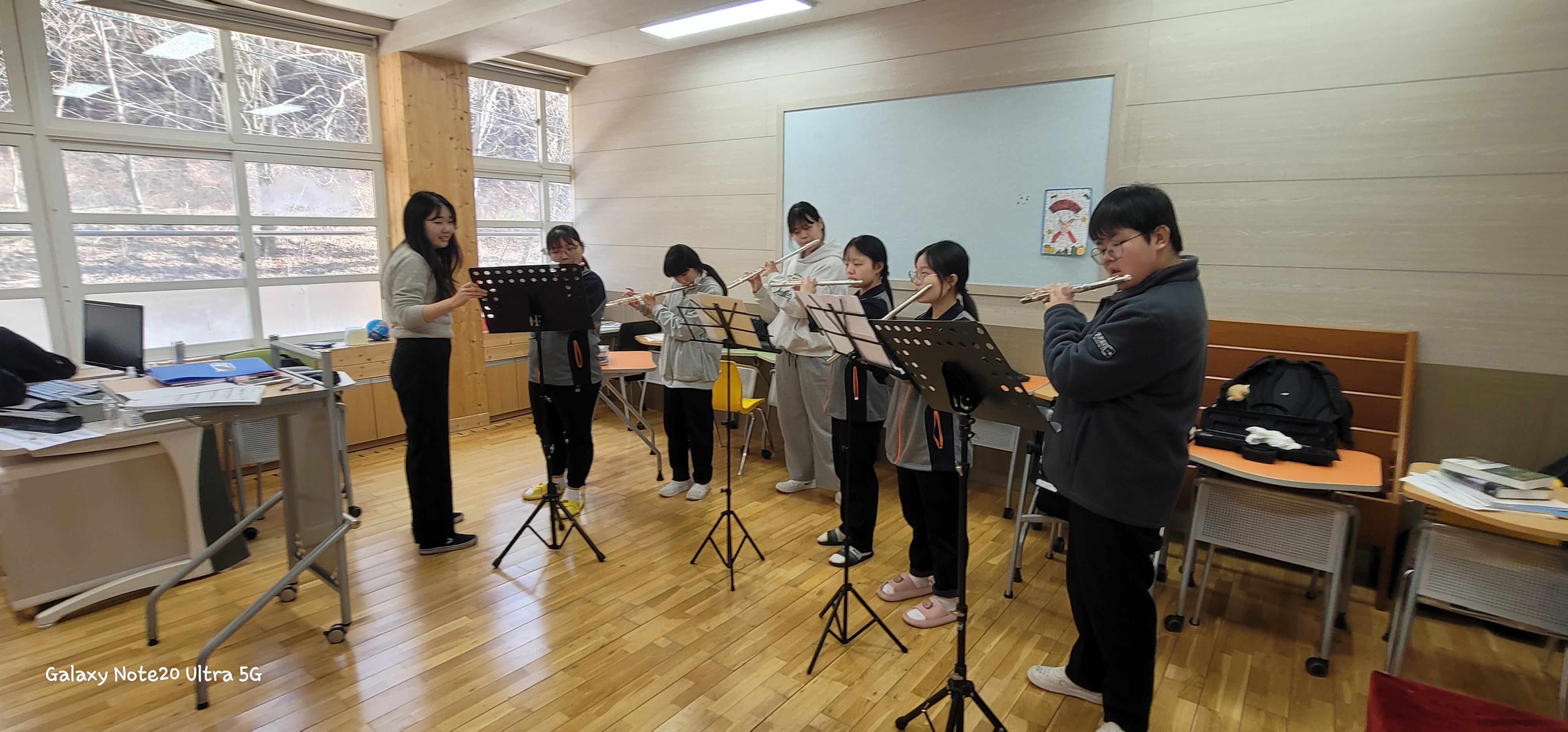 □ 플룻반(2시간)은 플롯을 전공한 선생님께 기본 플롯 운지 기법에서부터 친근한 노래 연주까지 즐겁게 배우고 체험하는 음악 체험 프로그램이다. 학생들은 작년까지 교과 음악 시간을 활용하여 플롯이라는 악기를 접하고 연주법을 배우기 시작하였는데 좀 더 전문적인 배움에 목말라 있었다. 그래서 학생들의 흥미와 희망에 따라 올해부터 전문 강사 선생님의 지도를 받게 되었고 의욕적으로 즐겁게 배우고 있다. 개별수업 방식으로 깊이 있는 지도를 받고 바로 피드백을 받을 수 있어서 학생들의 호응도가 매우 높다.