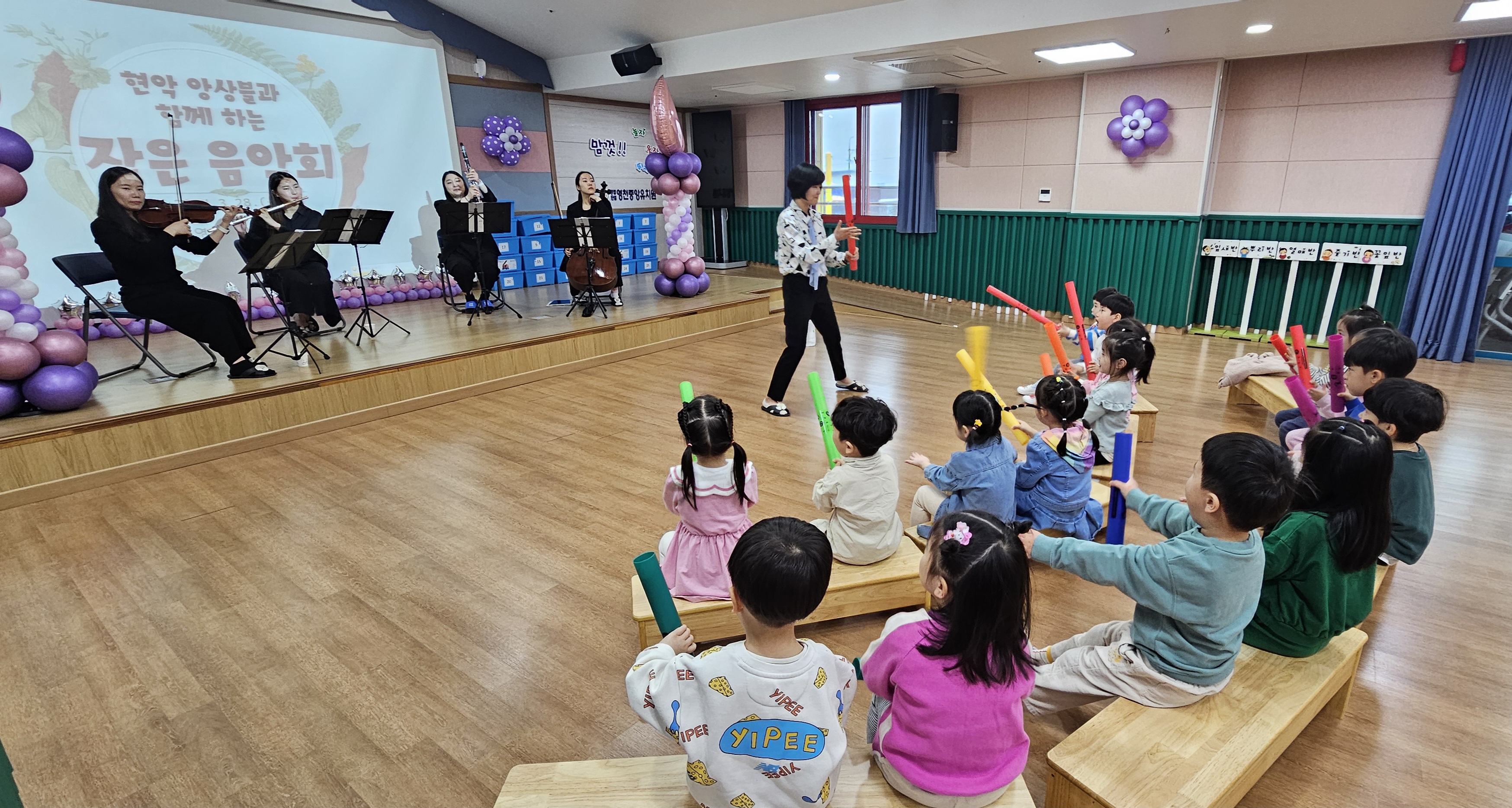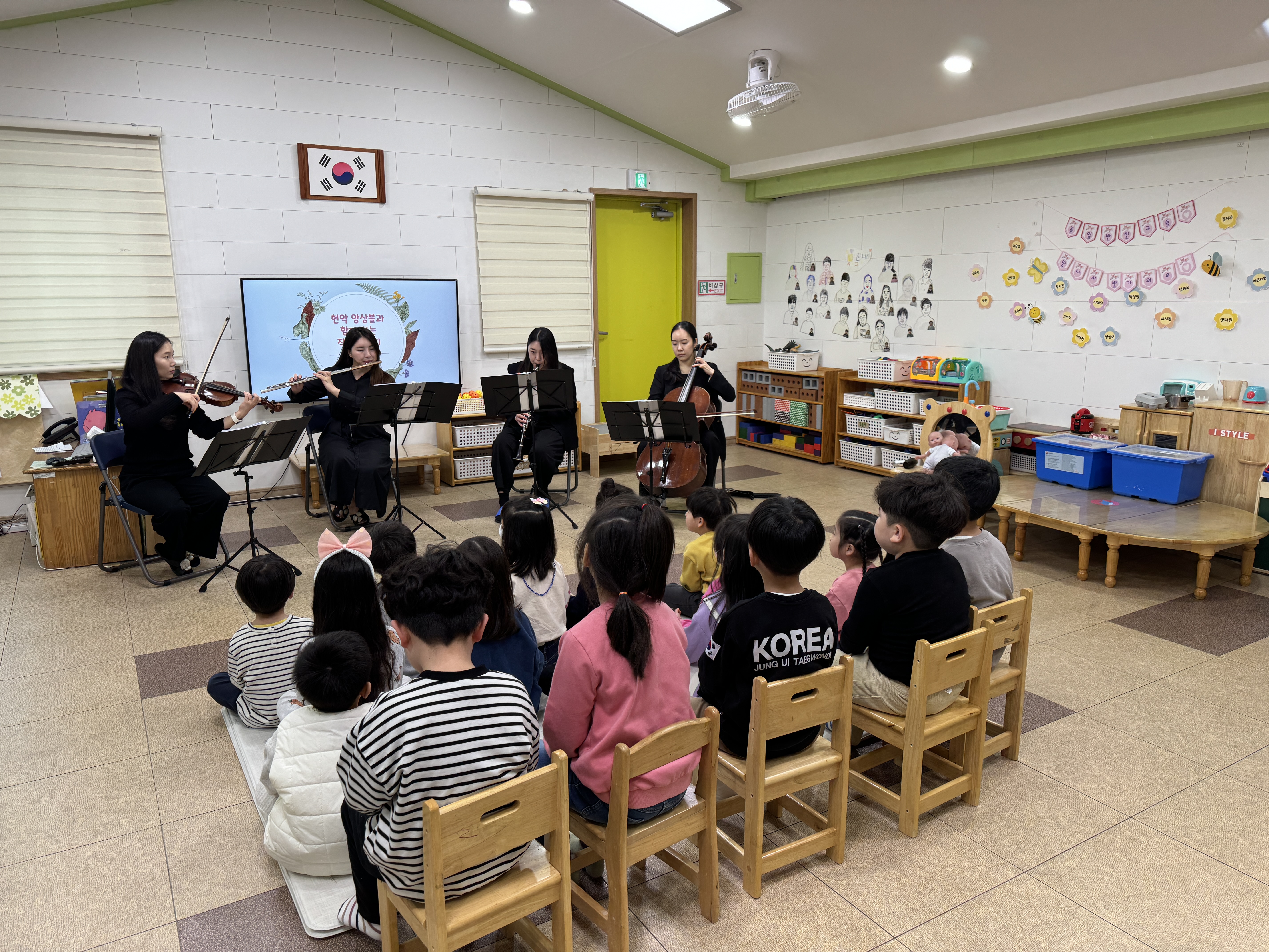 영천중앙유치원(원장 장미향)은 2024년 3월 28일(목) 현악 앙상블과 함께하는 작은 음악회를 개최하였다. 각 반별로 음악 감상 기회를 제공하여 클래식 음악과 동요를 감상하였고 해설사의 설명을 함께 들으며 유아들이 예술적 감수성을 키우고 문화예술을 한층 더 깊고 가깝게 향유할 수 있는 기회가 되었다.