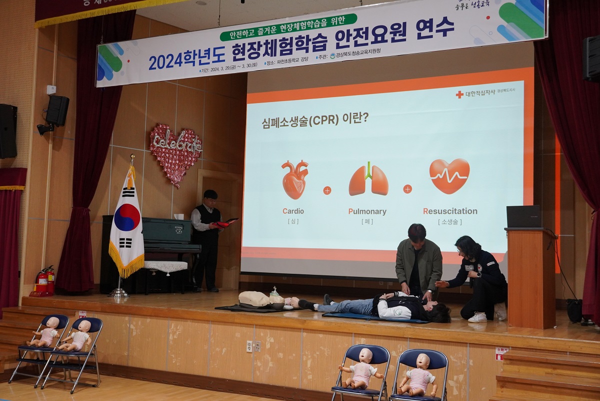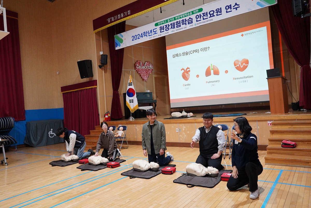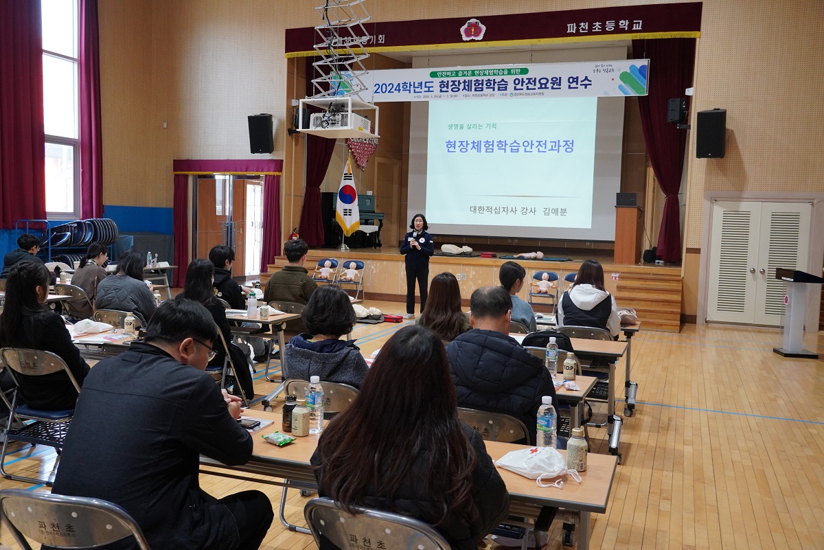 □ 경상북도청송교육지원청(교육장 신덕섭)은 29일(금)부터 이틀 동안 파천초등학교 강당에서 관내 신규교사 8명을 포함한 초·중·고등학교 교사 27명을 대상으로 『2024 현장체험학습 안전요원 연수』를 실시하였다.
