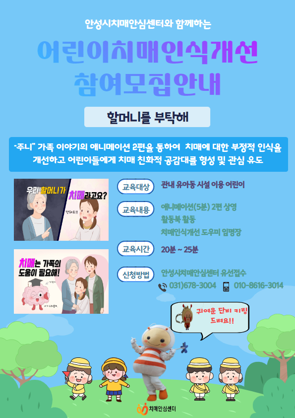 이번 어린이 치매인식개선교육은 유·아동 시기부터 치매에 대한 올바른 인식을 갖도록 돕기 위해 어린이 눈높이에 맞춰 제작한 교육 콘텐츠 ‘할머니를 부탁해’ 애니메이션과 워크북을 활용할 계획이다.