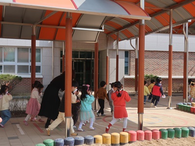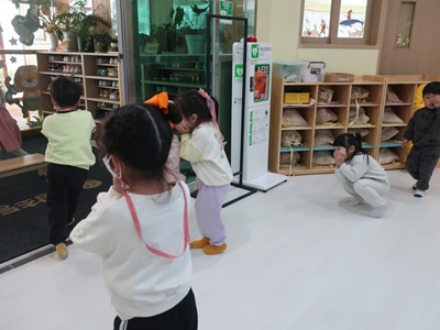 장소로 이동: 유아들은 손수건으로 입을 막은 후 신속하게 대피 장소로 이동했다. 우리 유치원에서 처음 참여하는 3세반 유아는 교사가 옆에서 함께 이동하며 안내하였다.