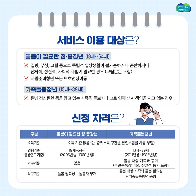 제공 대상은 ▶자립준비 청년 등 돌봄이 필요한 청년이나 중·장년(19~64세) ▶질병 등을 앓고 있는 가족을 돌보거나 그로 인해 생계를 책임지는 가족 돌봄 청년(13~39세)이다.