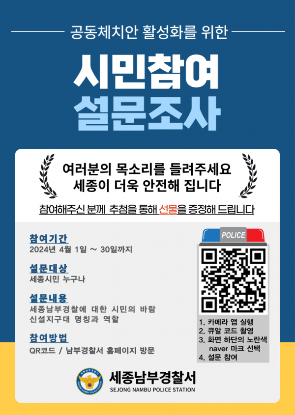 설문 참여 방법은 세종시민이 즐겨찾는 세종시닷컴, 맘카페, 세종경찰청·세종남부경찰서 홈페이지에 게시된 큐알코드를 통해 설문에 참여할 수 있다.