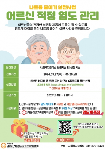 [금요저널] 의정부시에서 관리하는 의정부시 어린이·사회복지급식관리지원센터는 6월 28일까지 나트륨 줄이기 특화사업인 ‘어르신 대상 적정 염도 관리사업’ 참여 신청을 받는다.
