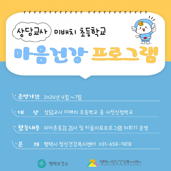 이 사업은 정서 문제·학교 부적응 학생 증가에 따라 학교마다 상담교사가 배치되는 추세이나, 상담교사가 배치되지 않아 정신건강 서비스 접근성에 어려움이 있는 초등학교를 대상으로 ‘마음건강 프로그램’을 2019년부터 추진하고 있는 평택시 자체 사업이다.