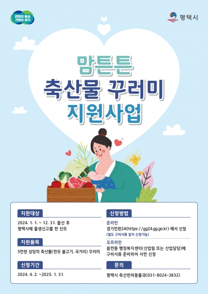 [금요저널] 평택시는 산모의 건강 회복과 출산 장려, 축산물 소비 촉진을 도모하기 위해 ‘맘튼튼 축산물 꾸러미 지원사업’을 실시한다.