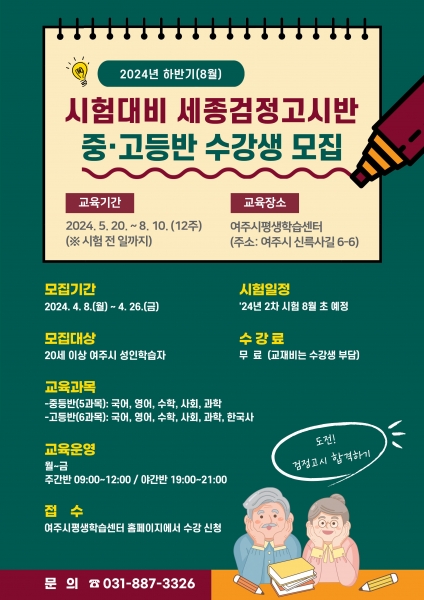 [금요저널] 여주시 평생교육과에서는 여주시 성인학습자의 중·고등 학력 취득을 통해 삶의 질을 향상하고 평생학습도시 활성화를 위한 ‘2024년 하반기 중·고졸 졸업학력 시험대비 세종검정고시반’ 수강생을 모집한다.