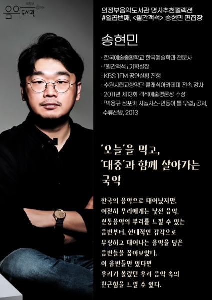 [금요저널] 의정부음악도서관은 4월 2일부터 두 달간 ‘‘오늘’을 먹고 ‘대중’과 함께 살아가는 국악’이라는 주제로 ‘월간객석’ 편집장 송현민의 추천 컬렉션을 운영한다.