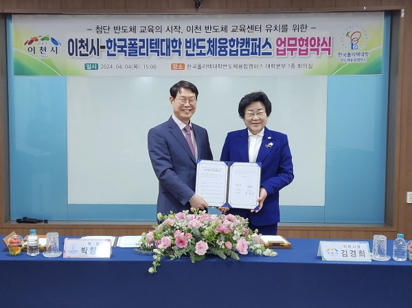 [금요저널] 이천시와 한국폴리텍대학 반도체융합캠퍼스는 4일 한국반도체융합캠퍼스 대학본부에서 이천반도체교육센터 유치를 위한 업무협약을 체결했다고 밝혔다.