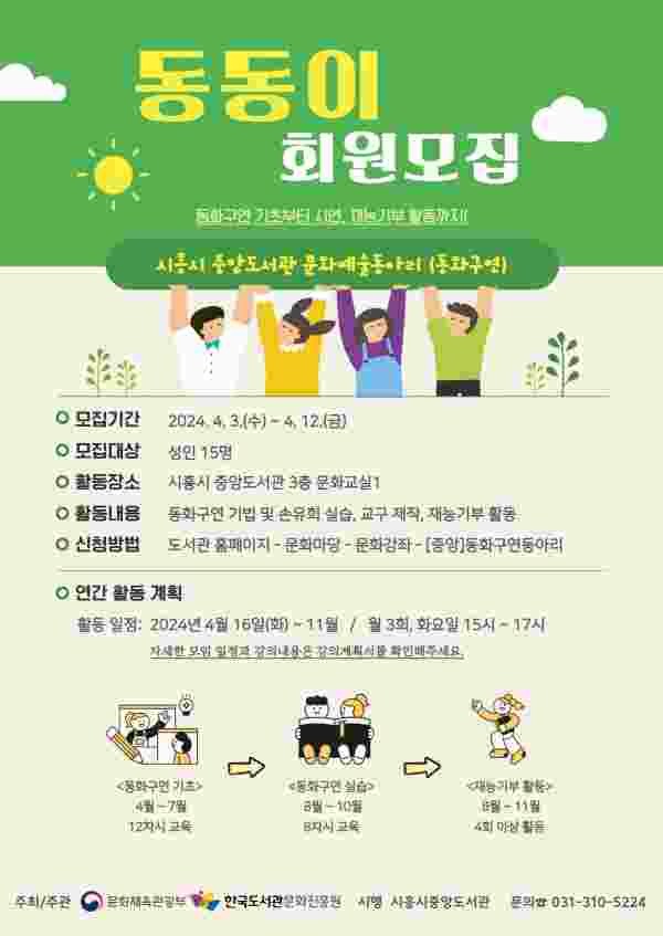[금요저널] 시흥시중앙도서관은 문화체육관광부가 주최하고 한국도서관문화진흥원이 주관하는 ‘2024년 도서관 문화예술동아리 활동 지원’ 사업에 2년 연속 시행기관으로 선정돼 4월 16일부터 ‘동화구연 전문교육과 실습’을 진행한다.