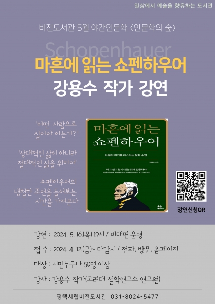 [금요저널] 평택시립 비전도서관이 오는 5월 16일 목요일 저녁 7시에 쇼펜하우어 신드롬을 일으키고 있는 화제의 책 ‘마흔에 읽는 쇼펜하우어’의 저자인 강용수 작가와 함께 마음의 위기를 다스리는 철학 강연을 비대면으로 진행한다.
