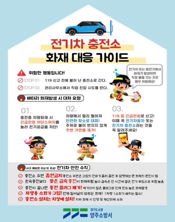 [금요저널] 양주소방서는 최근 전기차 보급이 확산됨에 따른 충전시설의 증가와 그에 따른 화재가 발생하고 있어 화재에 주의해달라고 당부했다.