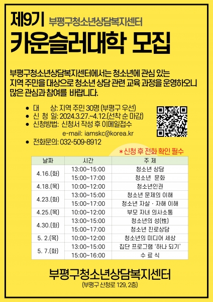 [금요저널] 부평구 청소년상담복지센터가 2024년 제9기 ‘카운슬러대학’ 참여자를 모집한다.