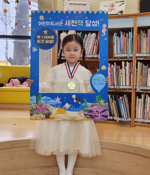 남윤아 어린이는 4월 6일 어린이도서관에 방문해 세천책 달성 인증서와 메달을 받았다.