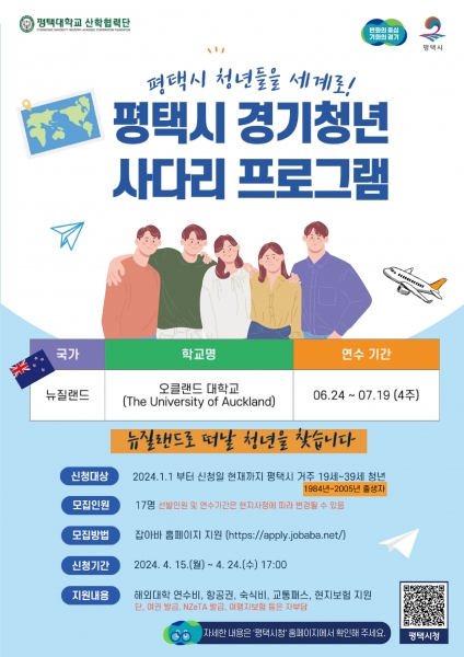 [금요저널] 평택시가 해외연수 경험을 통한 배움과 진로 개척의 동기를 제공하기 위해 ‘2024년 평택시 경기청년 사다리 프로그램; JourneyU 글로벌 리더쉽’ 참여자를 오는 15일부터 모집한다고 밝혔다.