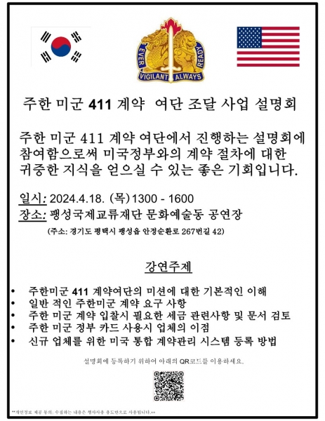 설명회 참여를 희망하는 기업은 ‘주한미군 411계약지원여단 조달 사업 설명회’ 초청장에 있는 QR코드를 이용해 사전 등록할 수 있다.