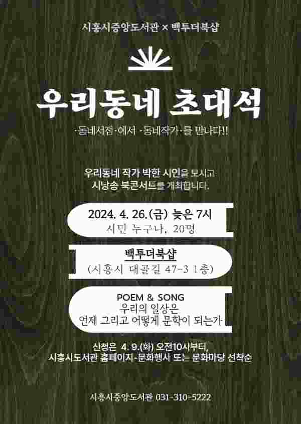 올해 우리 동네 초대석은 대야동에 소재한 서점인 백투더북샵에서 4월 26일 오후 7시에 박한 시인의 강연으로 시작된다.