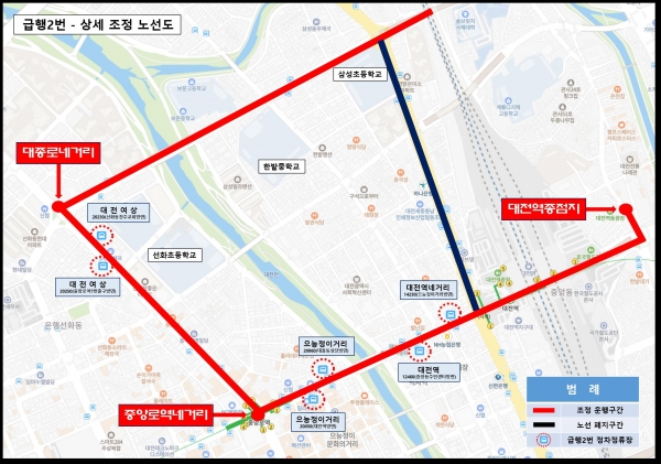 대전여상 정류장을 추가 정차하며 한밭종합운동장 및 옥계동까지 이동 시에는 급행4번으로 환승해야 한다.