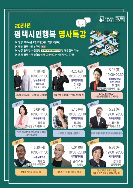 [금요저널] 평택시는 평생학습 활성화를 통한 시민의 행복 증진을 위해 노력하는 평택시의 평생학습사업의 하나로 대한민국 최고의 강사진으로 구성된 ‘2024년 평택시민행복 명사특강’ 강연을 오는 18일부터 운영한다.