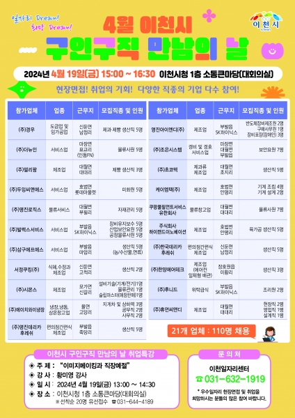 이천시청 1층 소통큰마당에서 진행되는 ‘구인구직 만남의 날’ 행사는 제조업, 서비스업, 물류창고업 등 다양한 직종의 21개 중소기업이 참여해 110명을 채용할 예정이며 이천시 고용복지플러스센터 등 여러 유관기관이 참여한다.