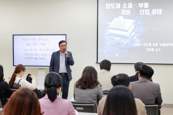 첫 번째 강의는 강성철 울산과학기술원 반도체 소재부품 대학원 산학협력중점교수가 ‘반도체 소재·부품·장비 산업 생태계’를 주제로 약 한 시간 동안 반도체산업의 생태계와 전 세계의 반도체산업을 위한 지원과 중점 분야에 대해 설명했다.