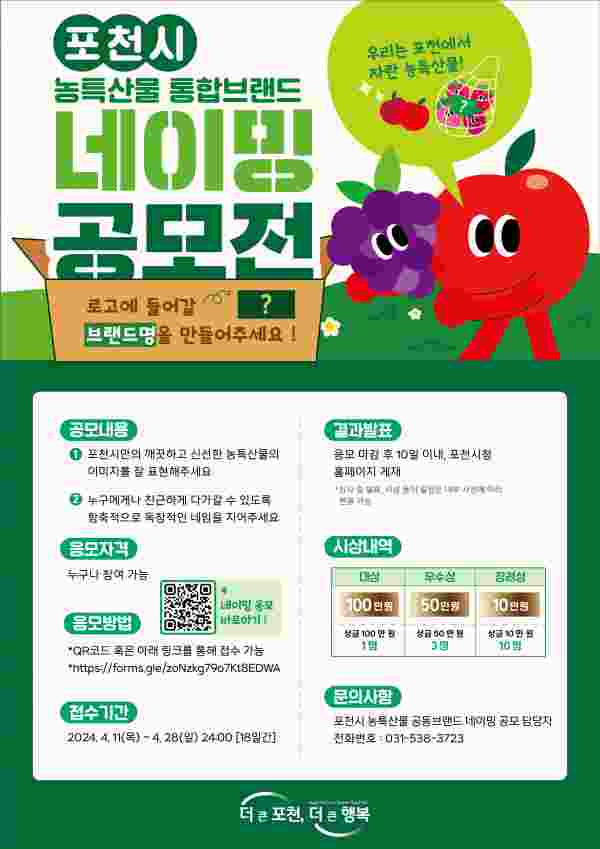 [금요저널] 포천시는 오는 28일까지 포천시의 고유한 지역 특성과 정체성이 반영된 농특산물 통합브랜드의 이름을 찾기 위해 전국민을 대상으로 이름 짓기 공모를 진행한다.
