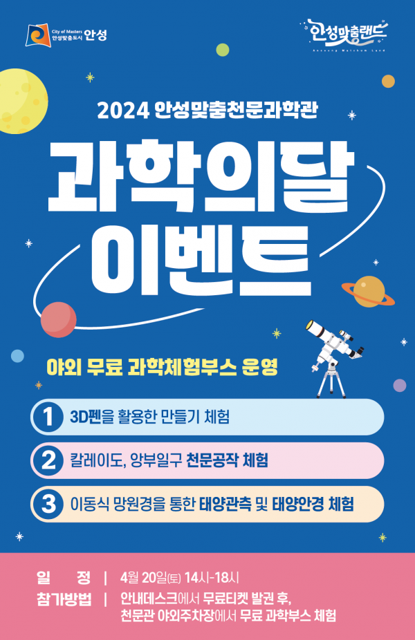 4월 20일 오후 2시-오후 6시 동안, 안성맞춤천문과학관 앞 야외주차장에서 다양한 무료 과학체험부스를 계획 중이다.